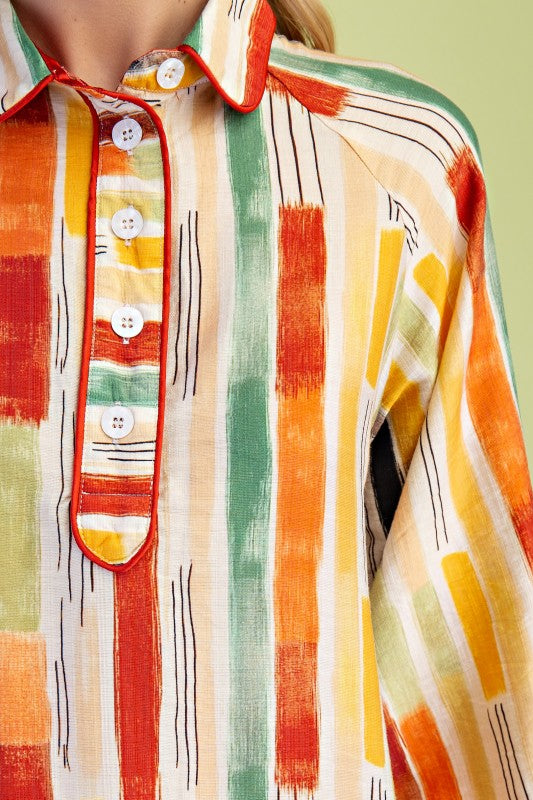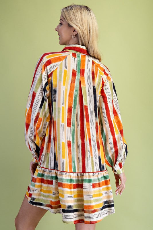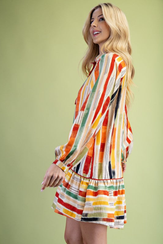 Abstract Striped Long Sleeve Popover Dress with Piping Details