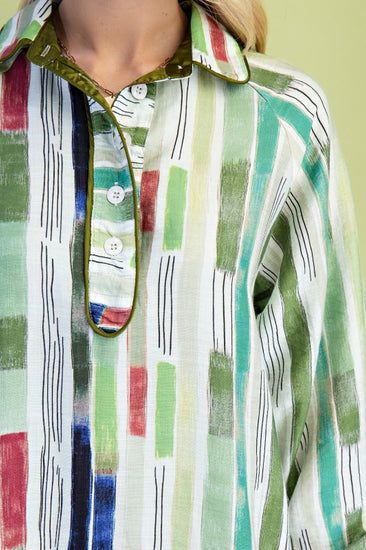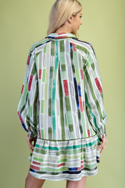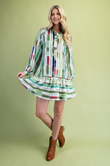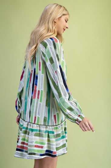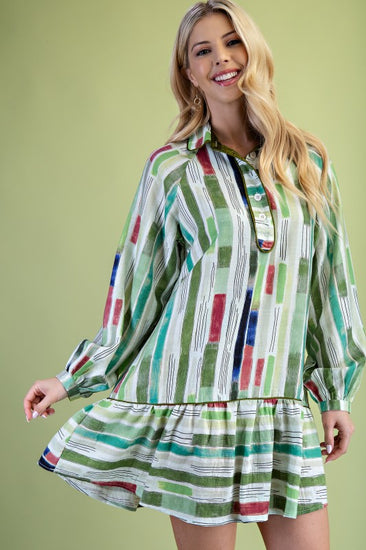 Abstract Striped Long Sleeve Popover Dress with Piping Details