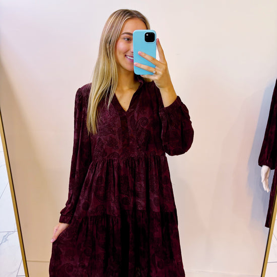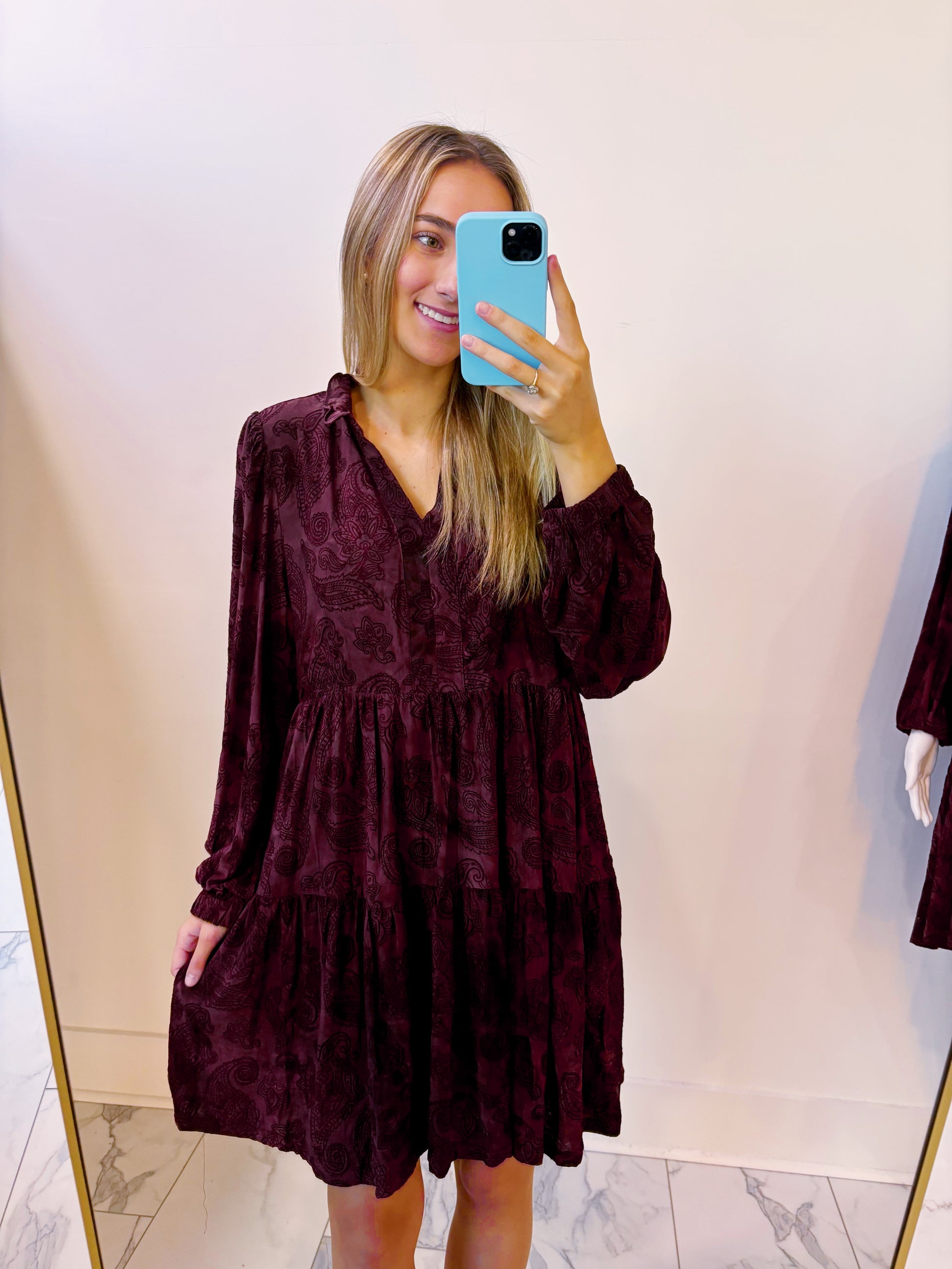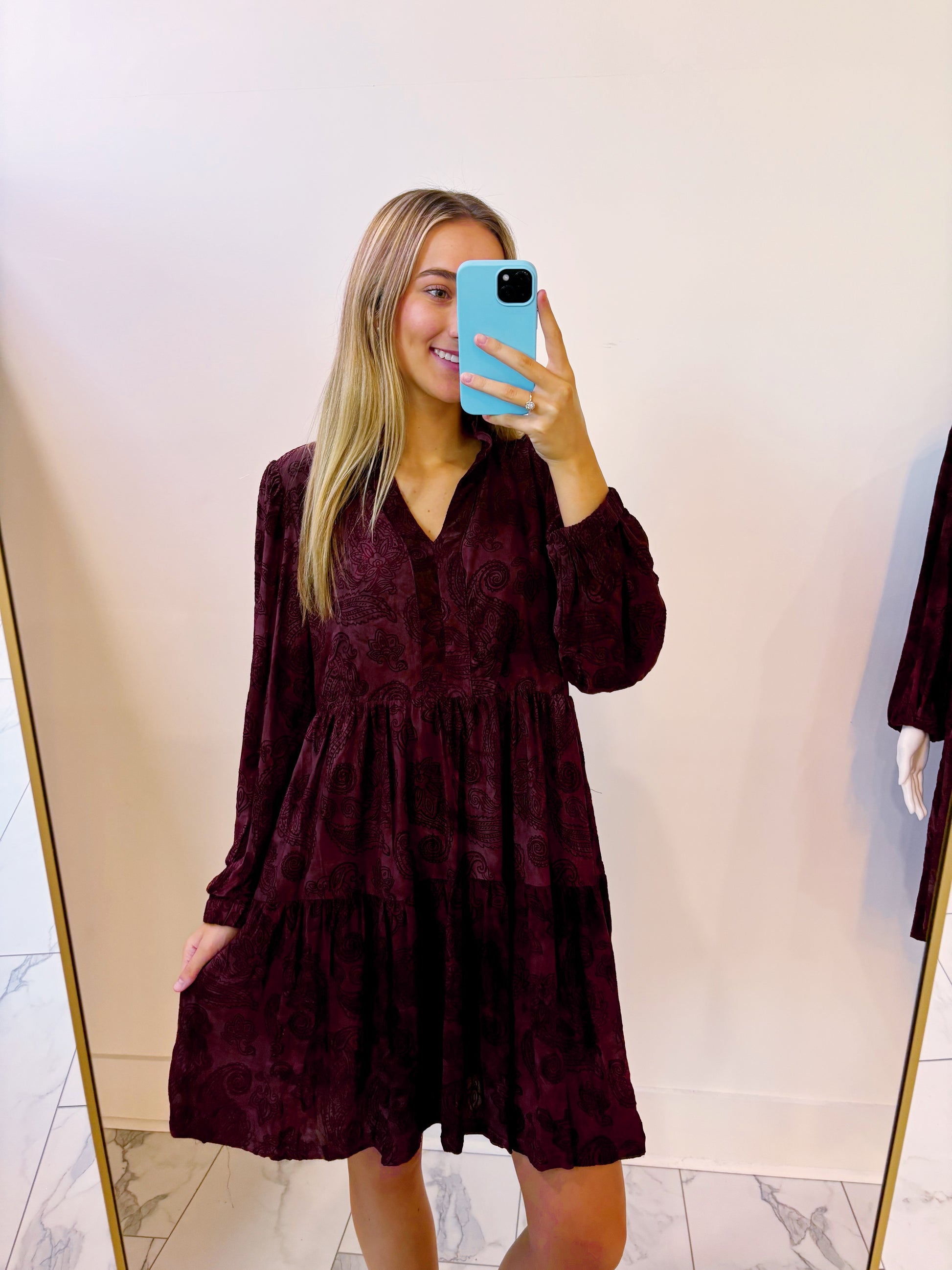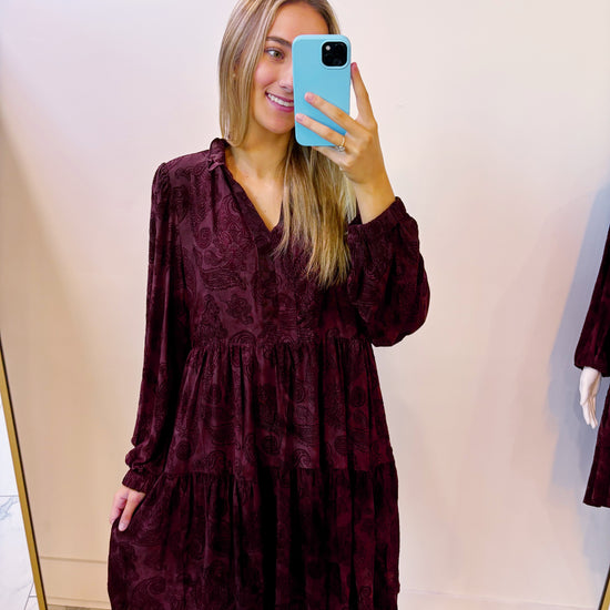 Boho paisley velvet flocking tiered dress, ruffled neckline, side pockets.
