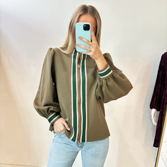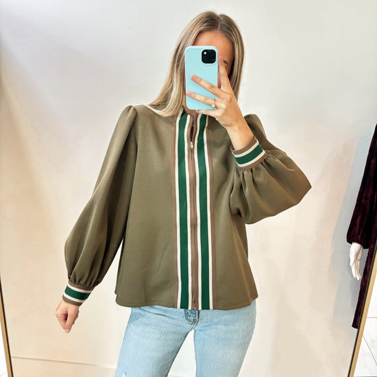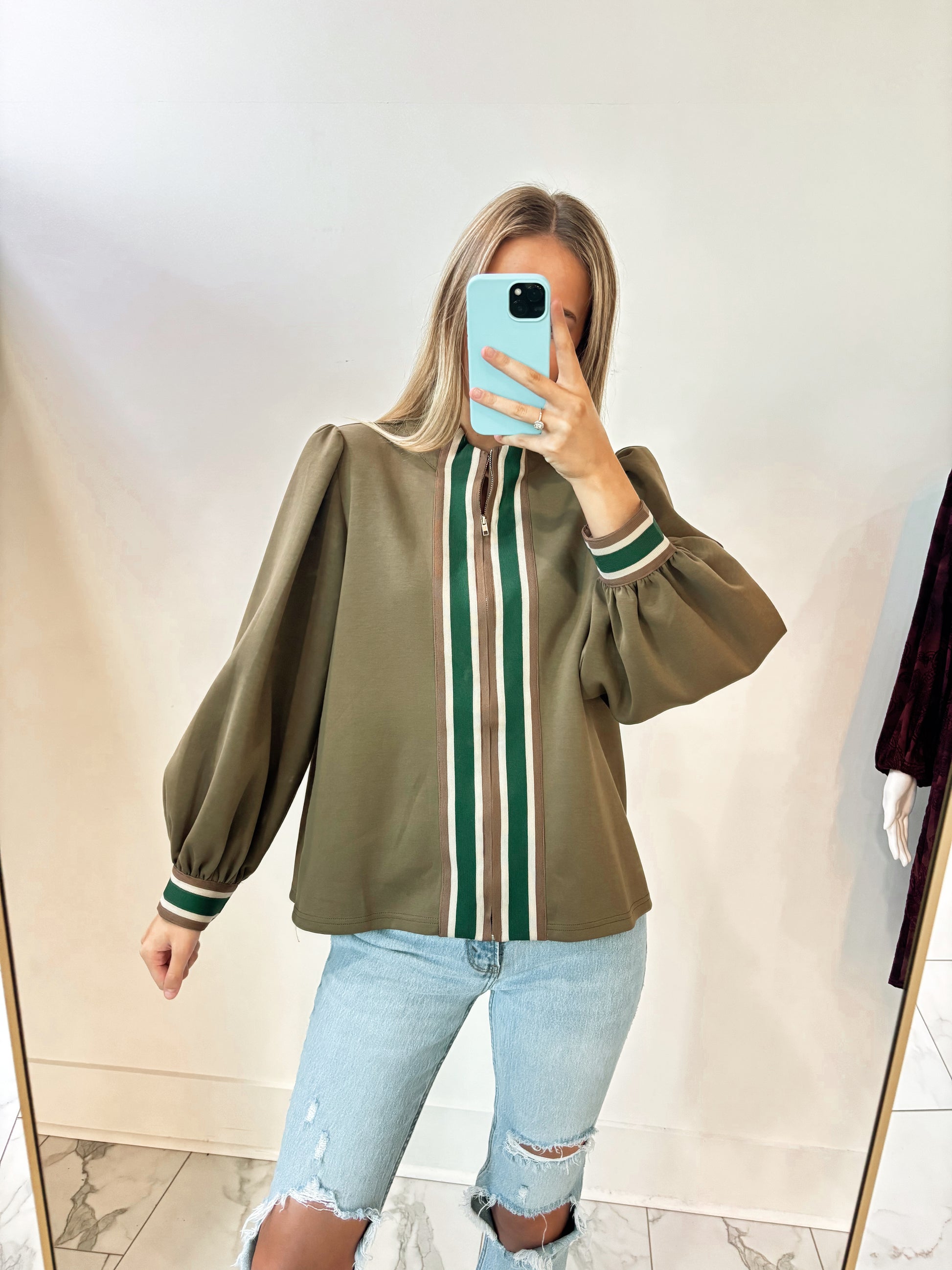 Long sleeves front zip up casual top with trim accent, high neckline, puff shoulder, color rib band trim.