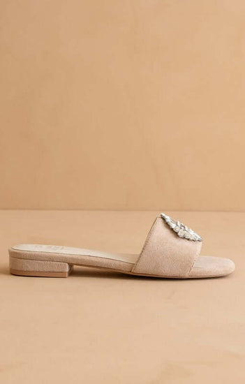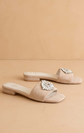 Bring a little sparkle to your day with a gorgeous brooch on an ultra chic suede sandals.