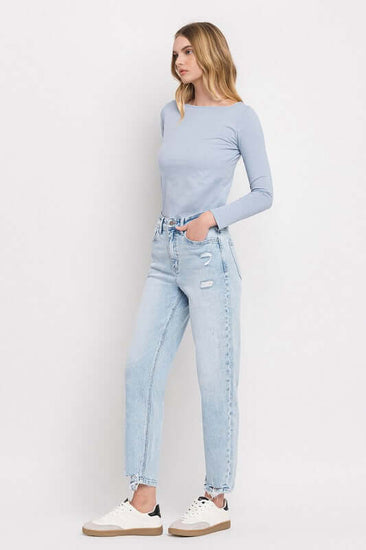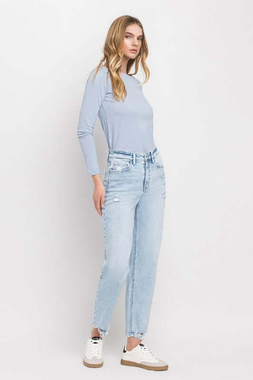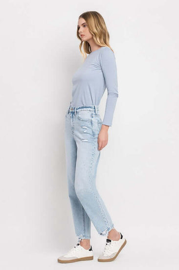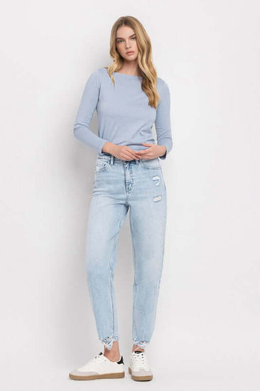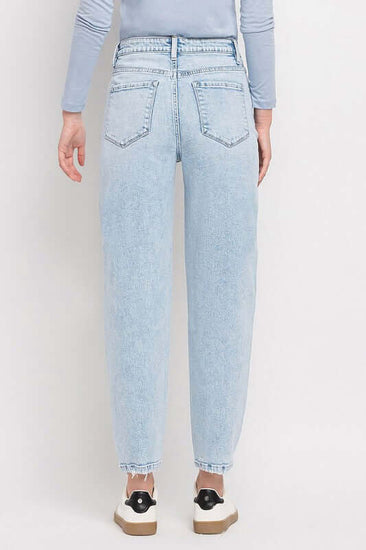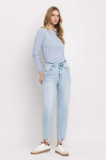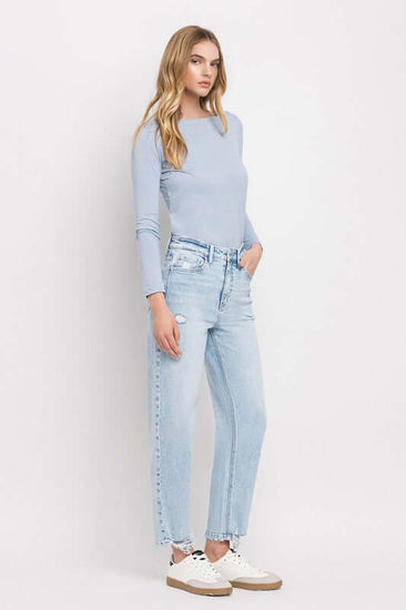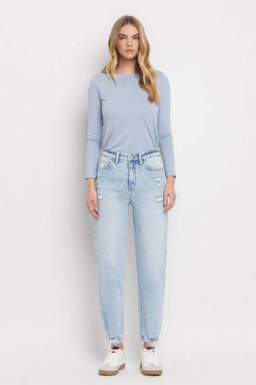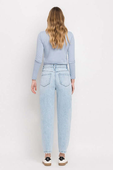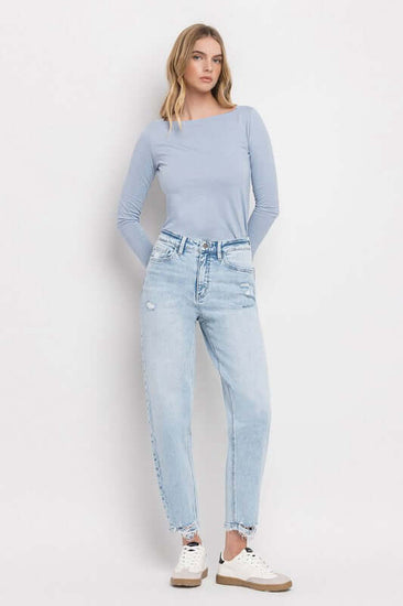 COMFORT STRETCH DENIM, SUPER HIGH RISE WAIST, DISTRESSED DETAIL, CROPPED LENGTH, BARREL LEG JEANS