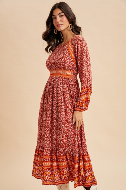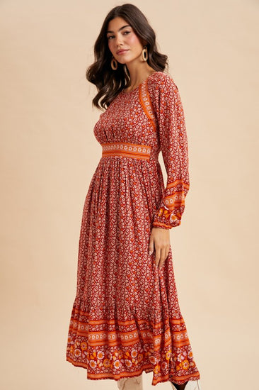 GORGEOUS BORDER PRINT MIDI DRESS FEATURING ELASTICATED SLEEVE OPENING, SMOCKED BACK WAISTBAND, BACK BUTTON CLOSURE FROM NECK TO WAIST, AND FULL LINING.