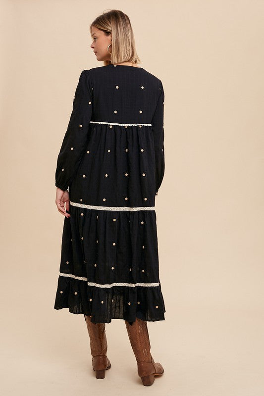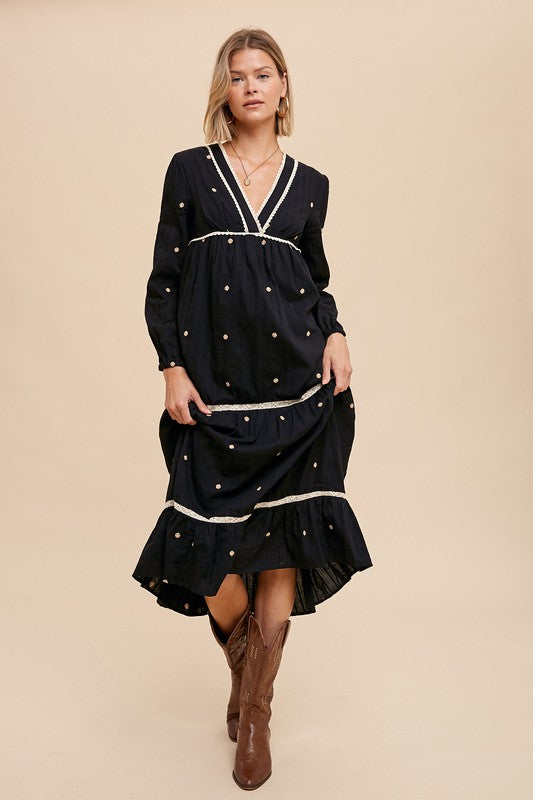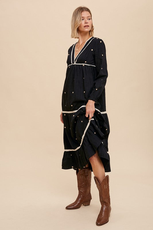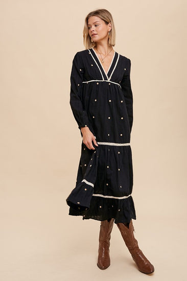 ALL OVER EMBROIDERY V NECK TIERED MIDI DRESS FEATURES LINING, LACE TRIM, V-NECK, LONG SLEEVE, LINING, AND SIDE INVISIBLE ZIPPER.