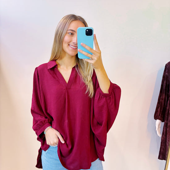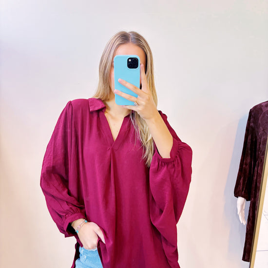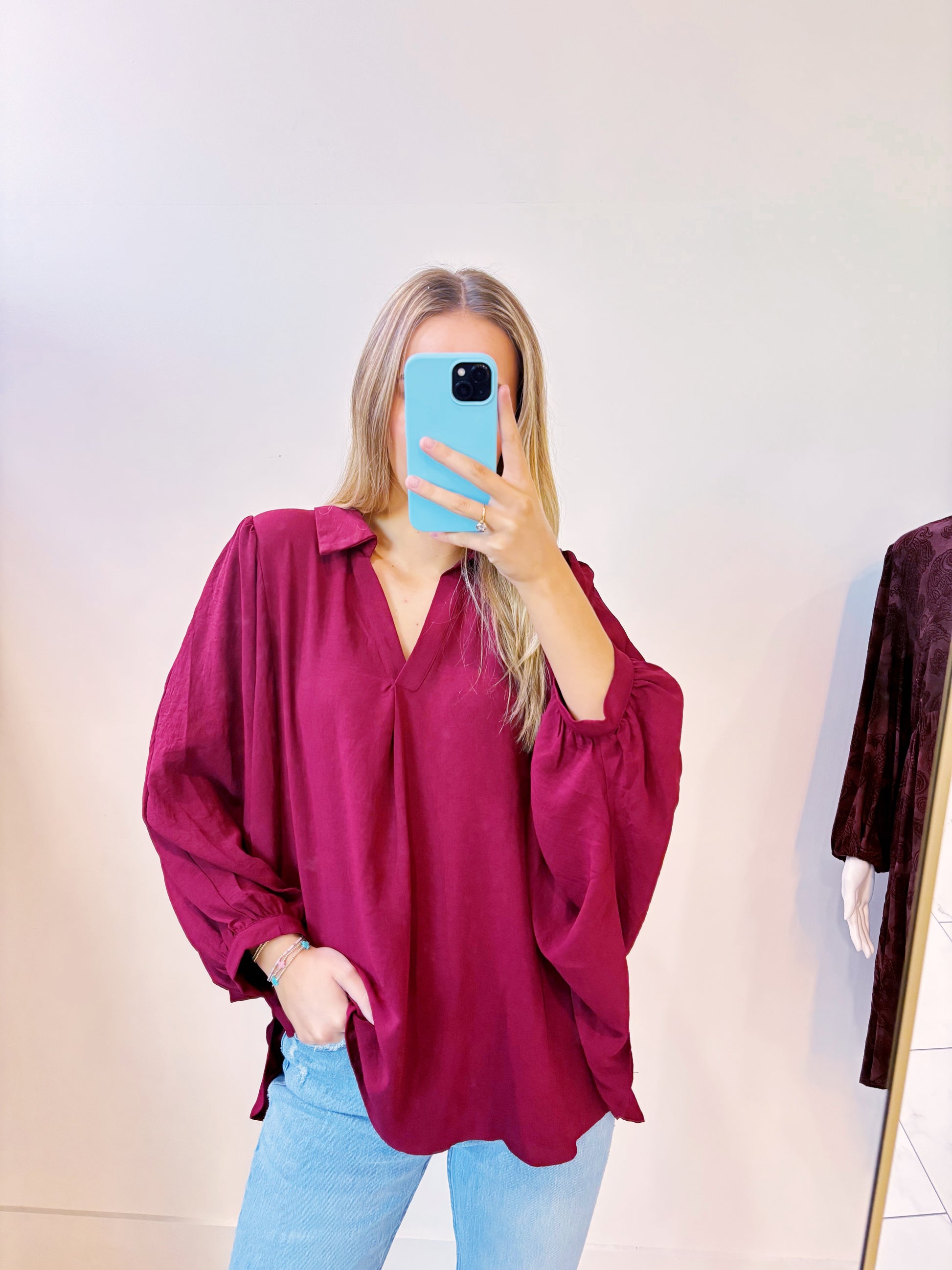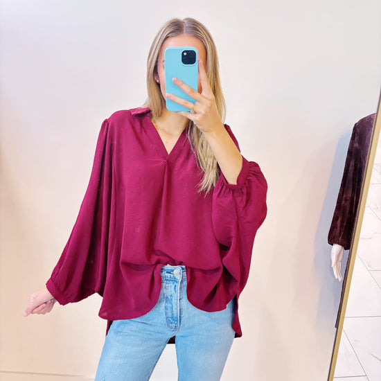 Long batwing sleeves crinkled top with front pleat detail, collared neckline.