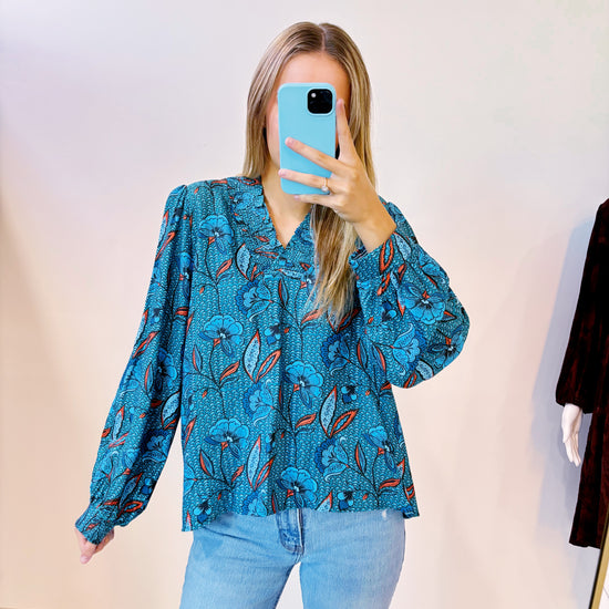 Long puff sleeves v neck floral top with smocked ruffle neckline.