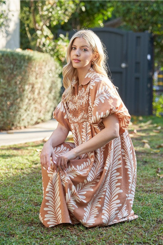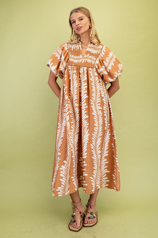 Printed Short Puff Sleeve Midi Dress with a Smocked Front Yoke