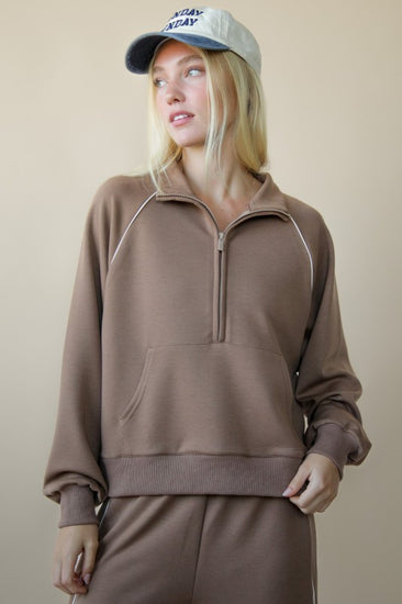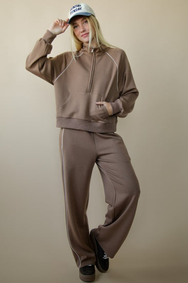 For superior functionality and effortless style, look no further than the Rochelle Matching Set. Its half zip and oversized design provide a comfortable fit, while the piping detail and front pocket add a touch of edginess. You'll also love the long sleeves for added warmth. Plus, the matching Wide Leg Knit Comfy Casual Sweat Pants feature an elastic waist and side pockets with zippers for a secure place to store your essentials. Both pieces are constructed from high-quality knit fabric, providing a flattering drape and lasting comfort. Get ready to elevate your casual wardrobe with the Rochelle Matching Set.