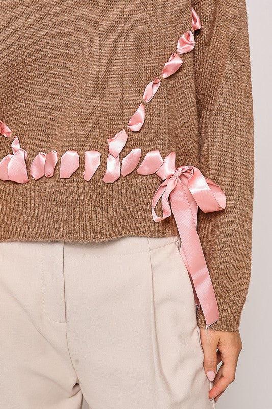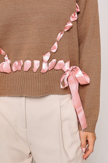 This fitted ribbon-laced sweater is a stylish blend of elegance and comfort. It features a crew neckline that offers a classic and versatile look. The unique design element is the ribbon lace detailing, which adds a touch of femininity and sophistication. The sweater is crafted from a soft, knit fabric, ensuring a comfortable fit that hugs the body perfectly. Its long sleeves and fitted silhouette make it an ideal choice for both casual and dressy occasions, effortlessly combining style and coziness.