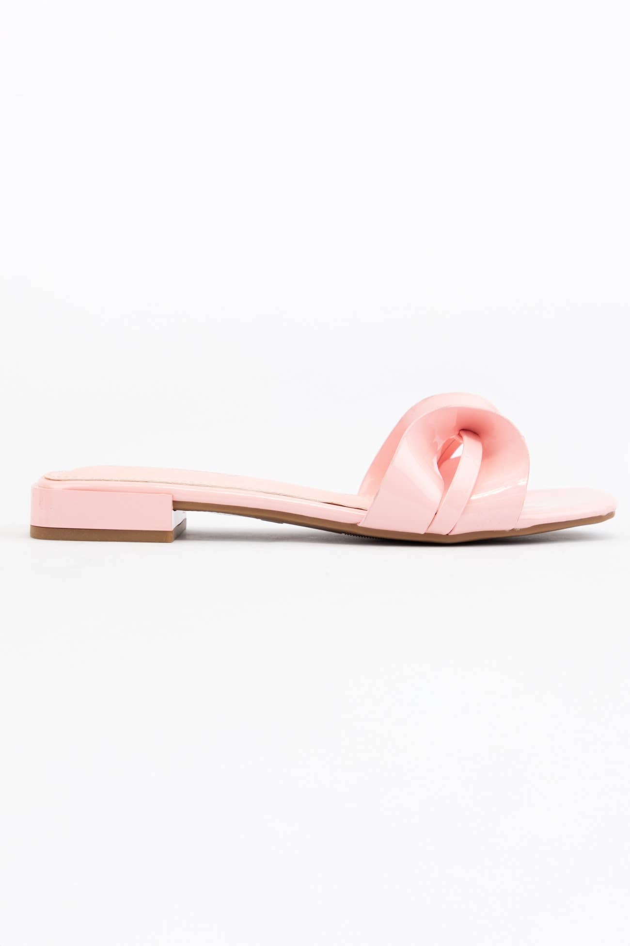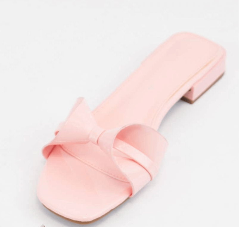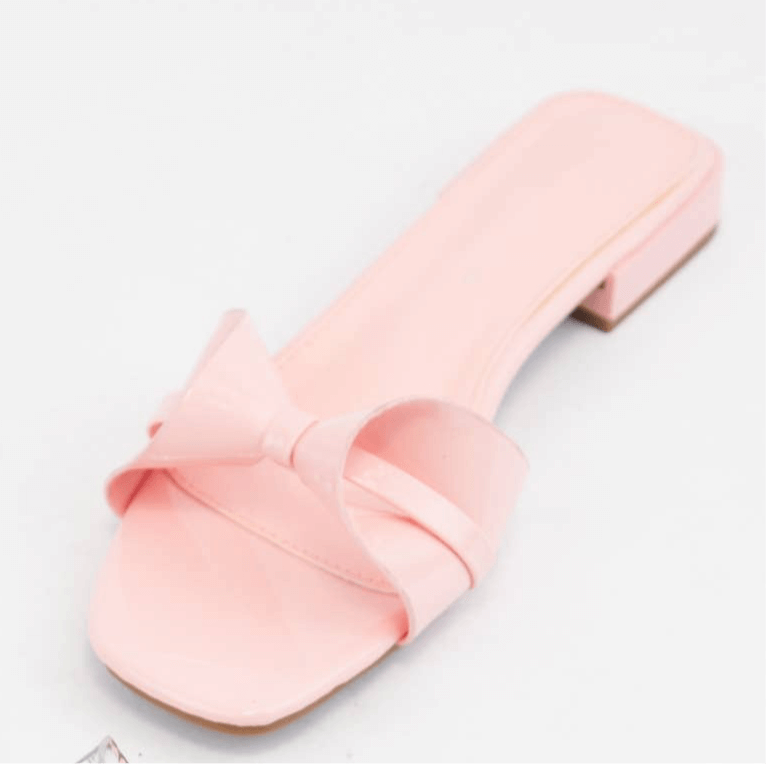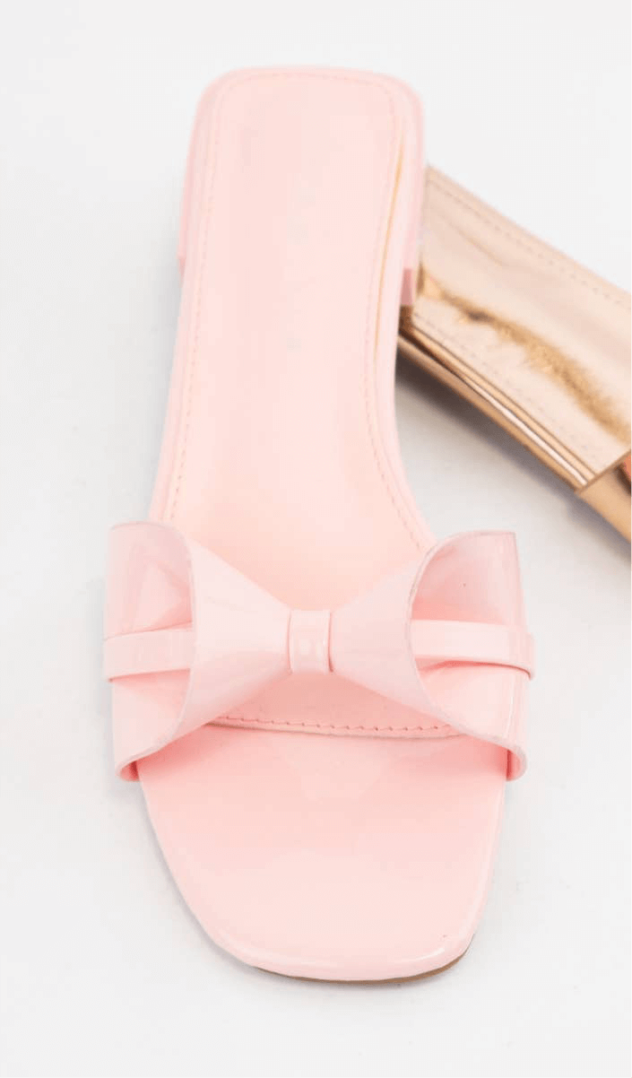 UNIQUE ORIGAMI STYLE ROLLED BAND IN BOW SHAPE OPEN ROUNDED SQUARE TOE GLOSSY FINISH PATENT PU MATERIAL