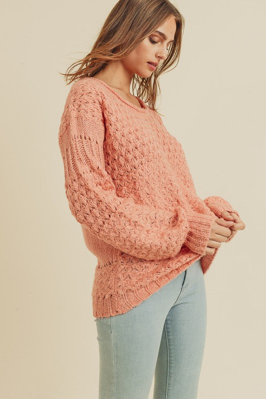TEXTURIZED KNITTED SWEATER WITH POINTELLE ACCENTS, BALLOON SLEEVE ENDS, AND A ROUND ROLLED NECKLINE.