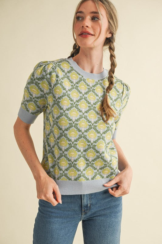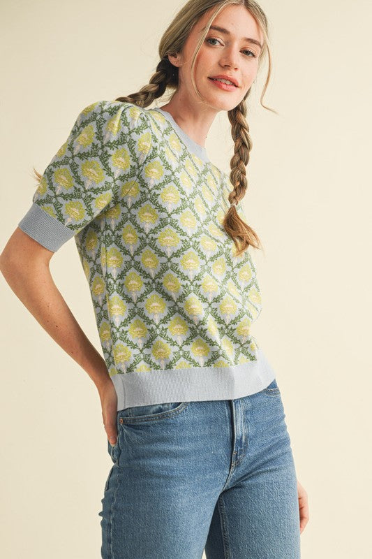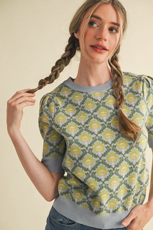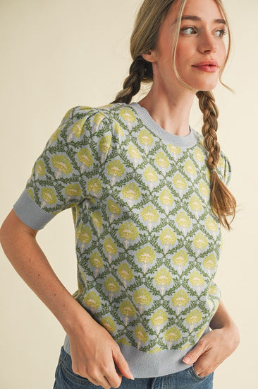 + Short puff sleeves with ribbed cuffs + Vintage floral pattern + Relaxed fit pullover